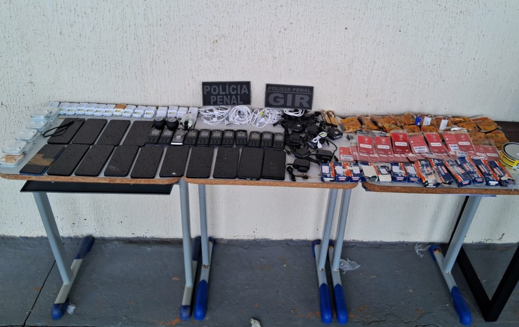 Entre os aparelhos apreendidos estão 13 smartphones e 11 celulares. Os policiais penais também apreenderam 27 carregadores completos, 25 chips, 10 fones de ouvido, 2 caixinhas de som bluetooth, além de três isqueiros, 15 pacotes de fumo e 13 caixas de massa adesiva.